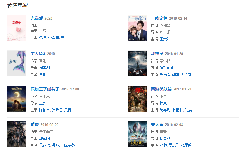 2016年在郭敬明執(zhí)導(dǎo)魔幻電影《爵跡》中飾演天束幽花。2017年在電影《西游伏妖篇》飾演小善。2018年3月,出演周星馳導(dǎo)演的環(huán)保題材電影《美人魚(yú)2》;同年9月,主演的青春勵(lì)志成長(zhǎng)劇集《斗破蒼穹》播出。2019年10月17日,入選2019福布斯中國(guó)30歲以下精英榜。