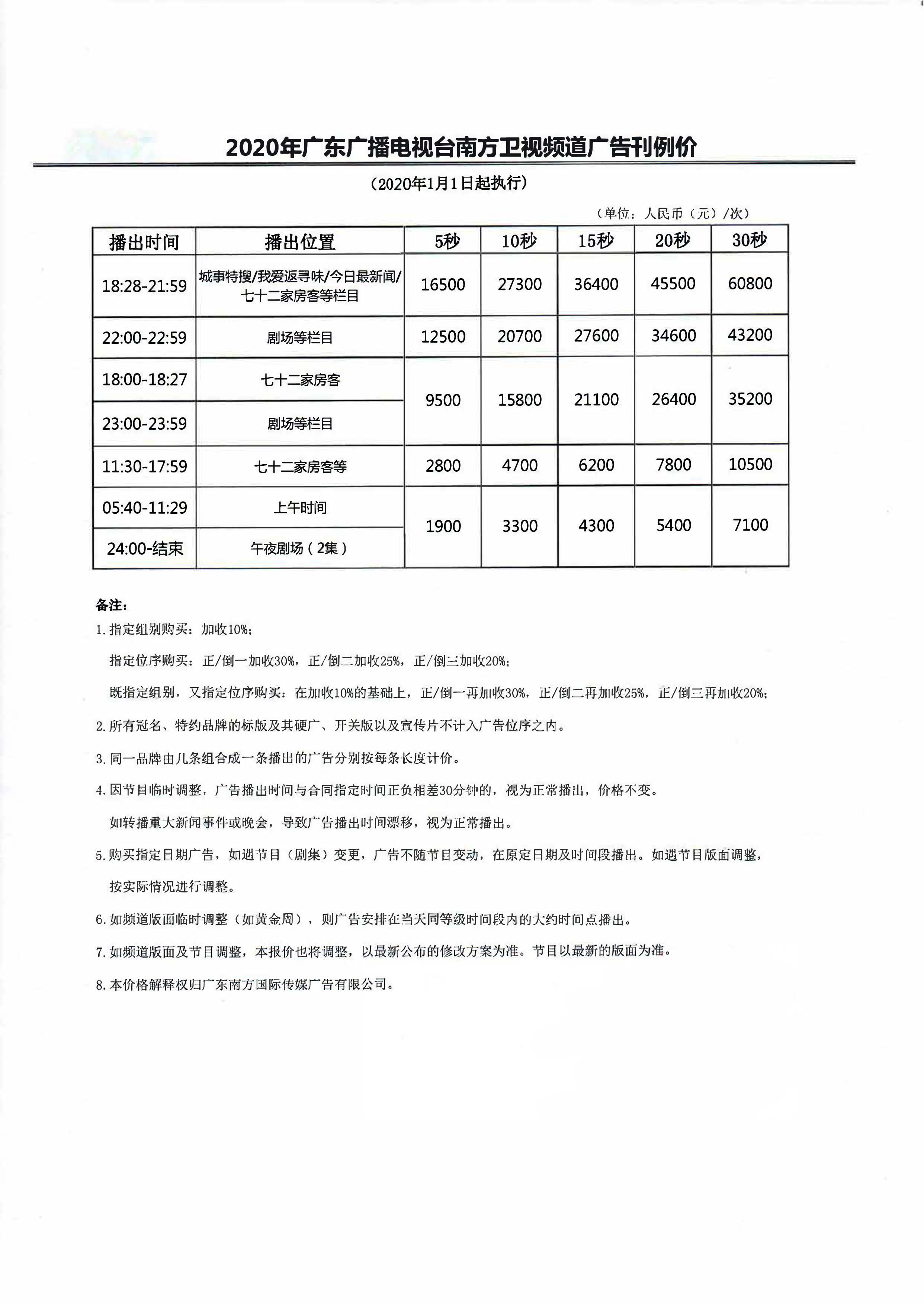 2020年廣東廣播電視臺南方衛(wèi)視頻道廣告刊例價