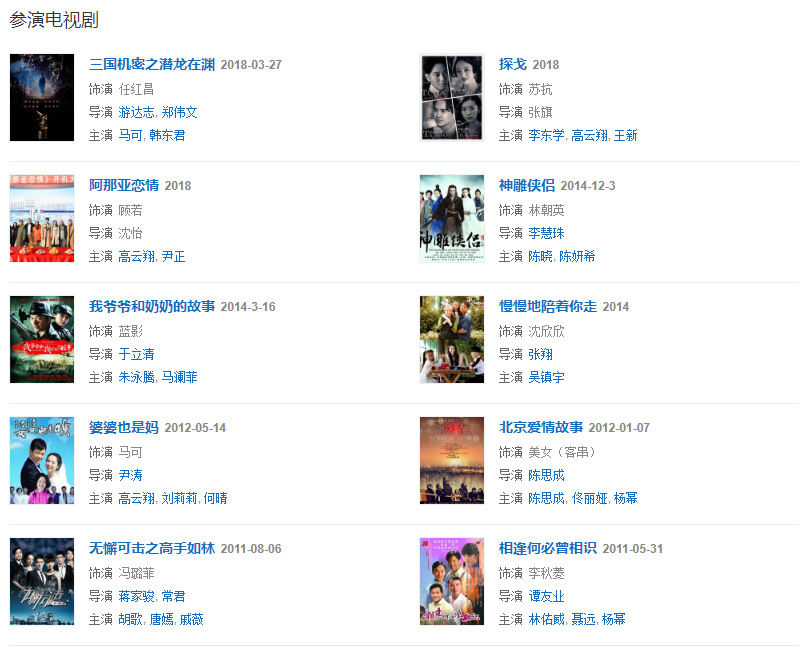 2003年,因主演武俠劇《雪花女神龍》而步入演藝圈。2005年,主演古裝武俠劇《君子好逑》 。2008年,憑借劇情片《立春》提名第27屆金雞獎(jiǎng)最佳女配角獎(jiǎng);同年,她還主演古裝武俠劇《八大豪俠》。2009年,因主演傳奇劇《闖關(guān)東中篇》獲得更多關(guān)注。2010年,主演都市懸疑劇《無(wú)懈可擊之美女如云》和青春勵(lì)志喜劇《青春期撞上更年期》。2011年,主演愛(ài)情劇《新拿什么拯救你,我的愛(ài)人》及都市商戰(zhàn)劇《無(wú)懈可擊之高手如林》;同年,她還與高云翔在北京舉行婚禮。