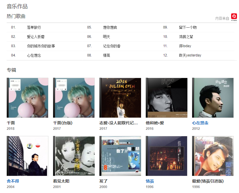 他和她》;同年5月,舉辦“志愛——沒人能取代記憶中的你”世界巡回演唱會。2017年,獲得亞洲音樂盛典頒發(fā)的“年度最佳飛躍進步藝人”獎。2018年,發(fā)行專輯《千面》。