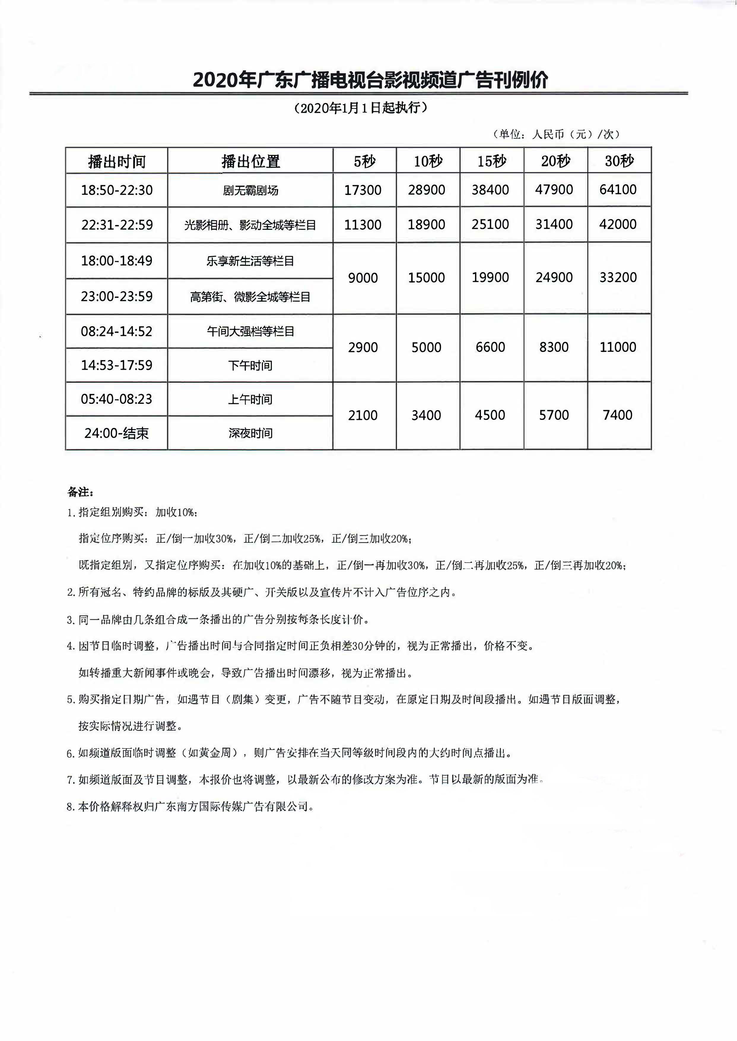 2020年廣東廣播電視臺南方衛(wèi)視頻道廣告刊例價(jià)