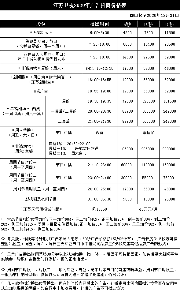 2020年江蘇電視臺(tái)江蘇衛(wèi)視廣告廣告刊例價(jià)