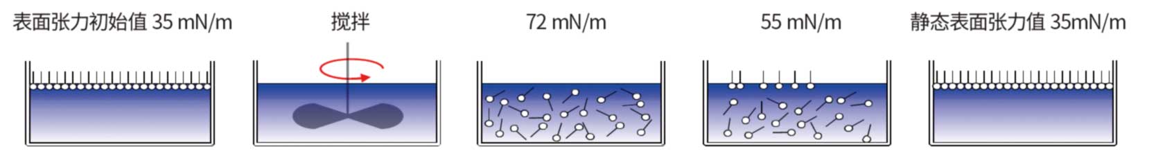 代表了表面活性劑的變化。表面活性劑被廣泛應(yīng)用于許多工業(yè)中,發(fā)揮作用的是它們的表面活性,即它們擴(kuò)散和吸附到新形成界面并影響其表面張力。進(jìn)一步,發(fā)揮作用的是表面活性劑的吸附過程快慢,以及在短時(shí)間內(nèi)表面張力的下降速度,要符合使用者的需求。因此使用者可能會(huì)尋找許多表面活性劑來測試不同環(huán)境下的實(shí)際效果,對(duì)于研發(fā)與生產(chǎn)都需要花費(fèi)大量時(shí)間與成本。
